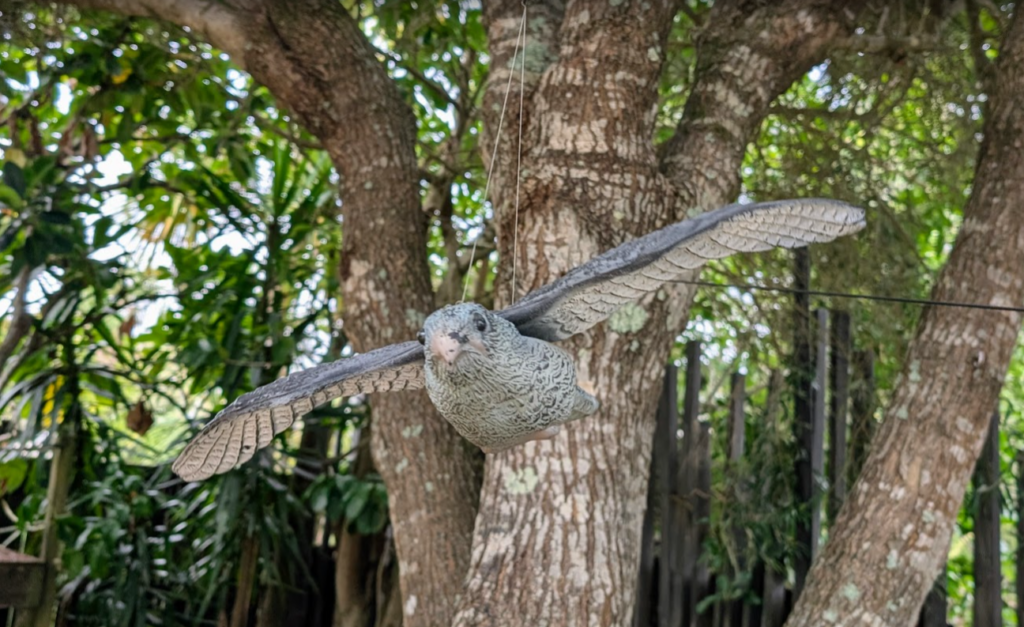 Playing youtube videos of owl, eagle and sparrow hawk noises through a speaker. Just annoying for me, not for the sparrows – unfazed.